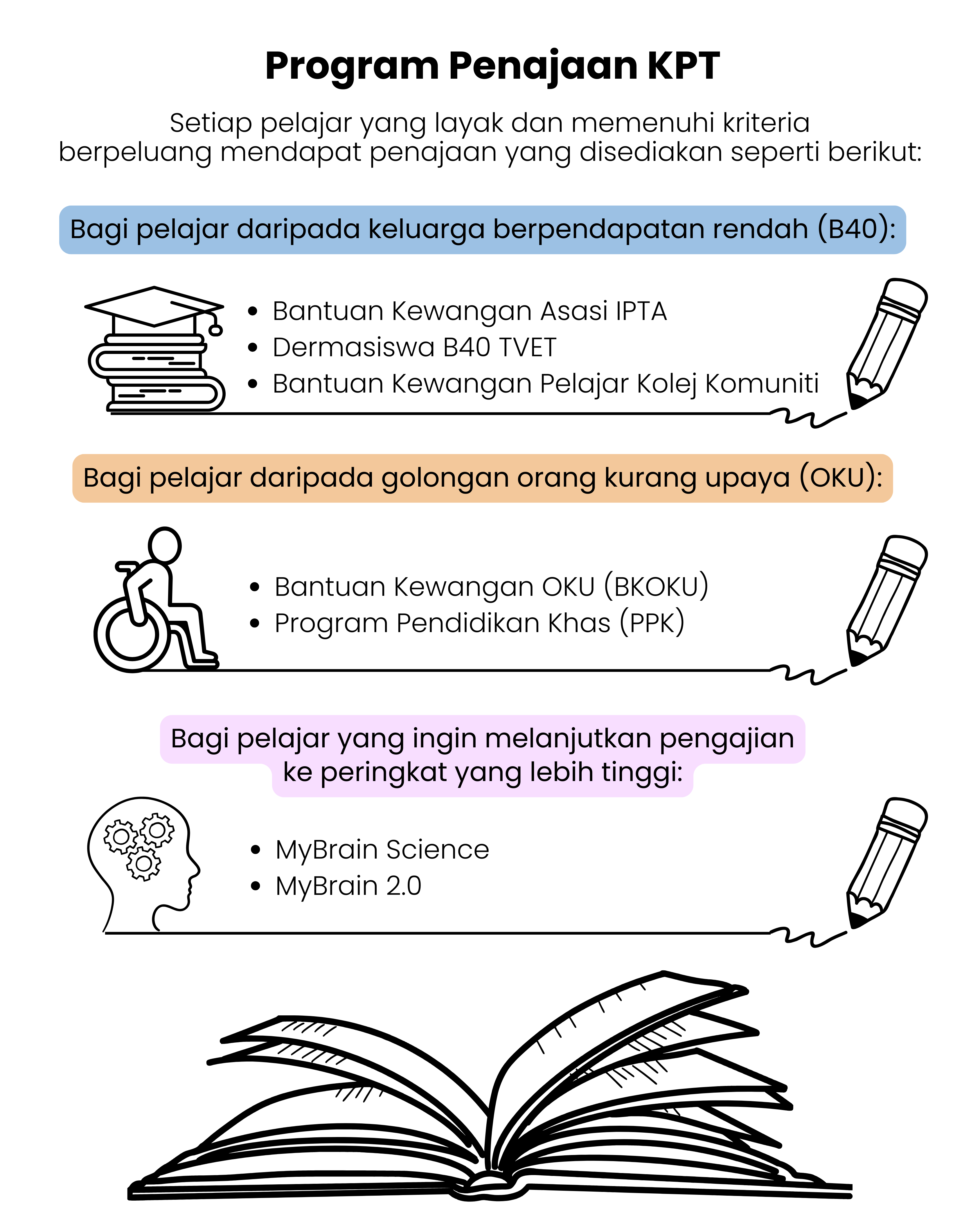 Tahukah anda, Kementerian Pendidikan Tinggi (KPT) menyediakan pelbagai peluang penajaan, khususnya bagi pelajar daripada keluarga berpendapatan rendah (B40) untuk melanjutkan pengajian ke peringkat yang lebih tinggi.